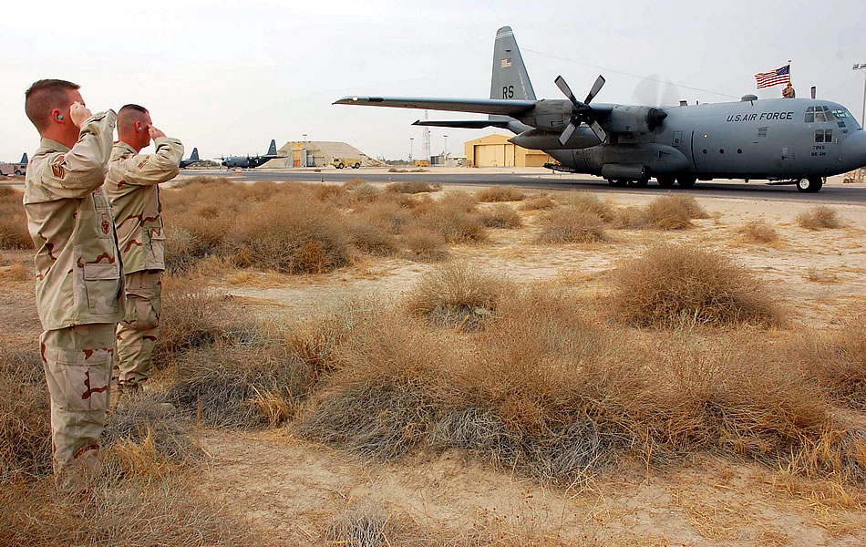 Related ArticleAirmen from the 386th Air Expeditionary Wing salute a C-130 Hercules, tail number 63-7865, Nov. 13 in Southwest Asia. The aircraft from Ramstein Air Base, Germany, had just flown its last combat mission and will be flown to Davis-Monthan Air Force Base, Ariz., where it will be laid to rest at the "boneyard." (U.S. Air Force photo/Staff Sgt. Tia Schroeder)