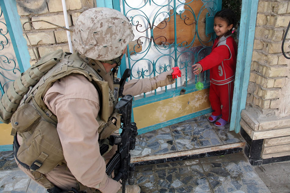 U.S. Marine Corps Capt. Rodrigo Cantu, with Regimental Combat Team 6's Police Transition Team 8, hands an Iraqi child a toy during a foot patrol with Iraqi police officers in Fallujah, Iraq, Dec. 16, 2007. U.S. Marine Corps photo by Cpl. Joseph A. Lambach.
