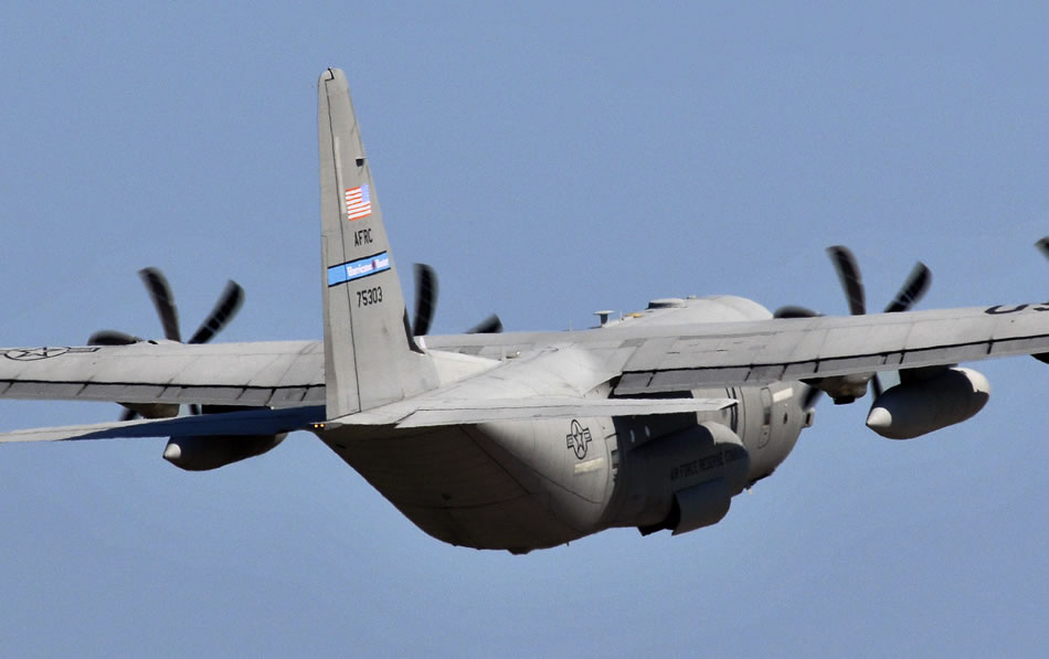 A WC-130J Hurricane Hunter takes off for a mission into the eye of Hurricane Ike Sept. 10 from Keesler Air Force Base, Miss. With the exception of two palletized weather stations, the WC-130J is not modified for missions into hurricanes and other troical weather. The aircraft is manned by reservists from the 53rd Weather Reconniassance Squadron. (U.S. Air Force photo/Tech. Sgt. James B. Pritchett)