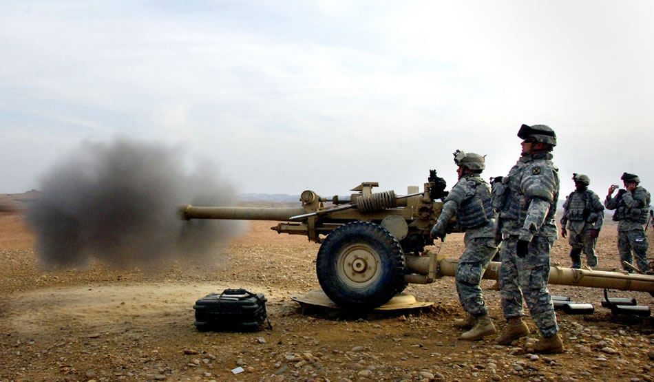 U.S. soldiers from 6th Field Artillery Regiment, 10th Mountain Division, fire a round from a howitzer during training at the Warrior Range in Kirkuk, Iraq, Jan.23, 2008. U.S. Army photo by Spc. Laura M. Buchta