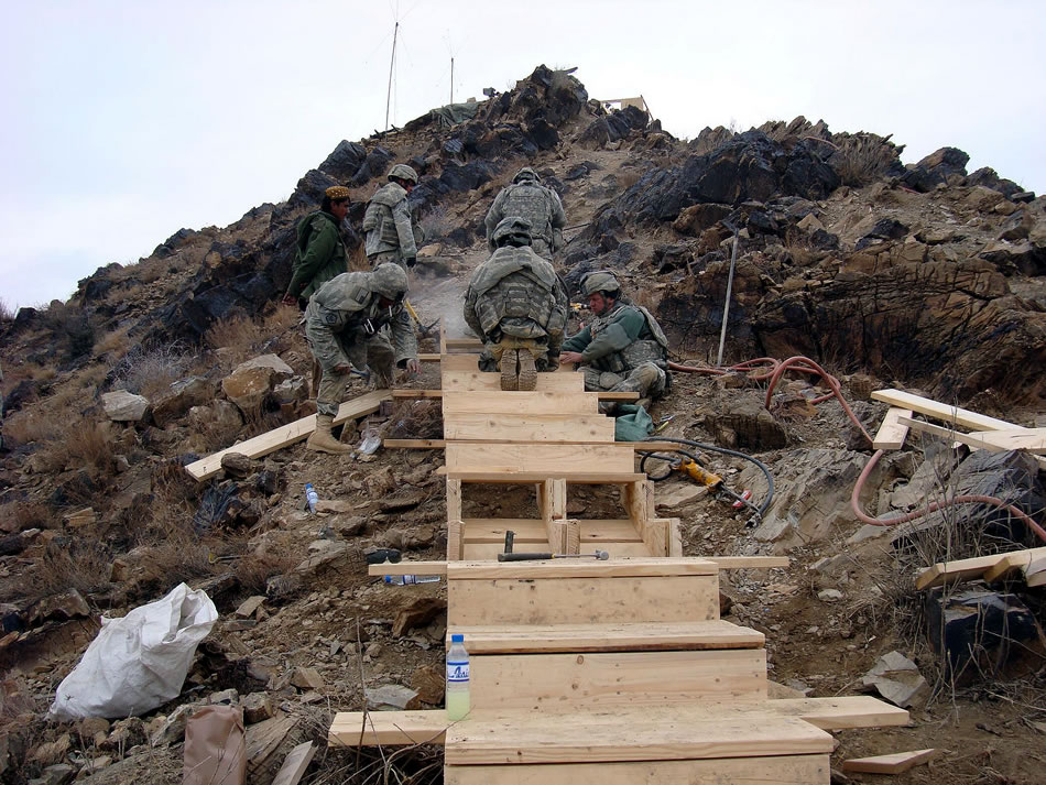 Soldiers work on the steps leading up the mountain to the outpost. Photo by Capt. Nicholas Melin